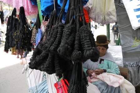ラパスに来て町を歩いた時に初めに目を奪われたのは、山高帽になが~い三つ編み、そしてカラフルな風呂敷を肩に担いだ、伝統衣裳に身を包んだこのチョリータおばちゃんたち!
